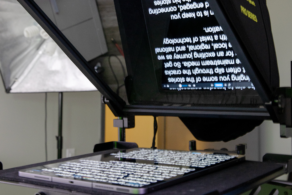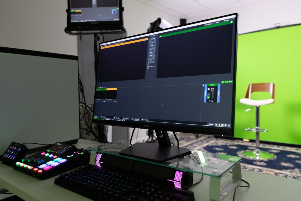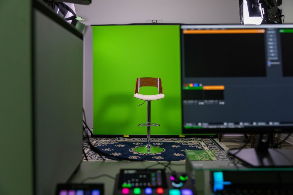 Real-time chroma key greenscreen setup, ideal for newscasts, podcasts, interviews, live streaming, and training videos.